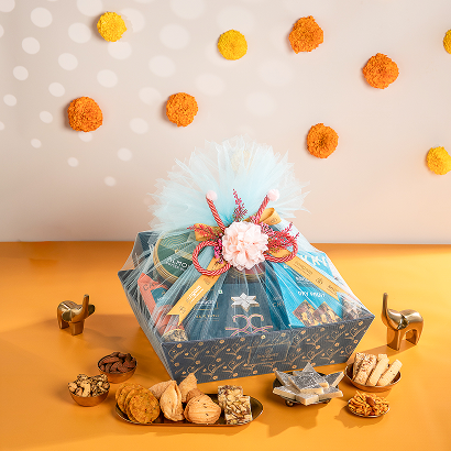 Celebrate special festive moments with Manohar Sangrah, a carefully curated hamper featuring Kaju Burfi, Almond Butter Biscuits, Mixture Special, Roasted Almonds Salt & Pepper, Roasted Cashew Salt & Pepper, Atta Puri, Cocktail Samosa, Jeera Biscuits, and Dryfruit Chikki. Perfect for gifting or family celebrations, this hamper blends sweet, nutty, and savory delights for a truly indulgent experience.