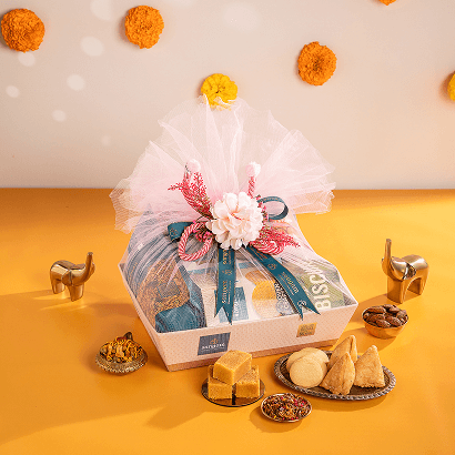 Spread joy with Rajsi Utsav, a delightful hamper featuring Cocktail Samosa, Mysore Pak, Osmania Biscuits, Mixture Navarathan, Roasted Almonds Salt & Pepper, and Gulab Mix. Perfect for gifting or festive celebrations, this hamper blends sweet, savory, and nutty treats that bring happiness to every occasion.