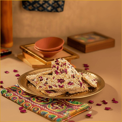 Rose Til Patti adds a floral twist to the traditional sesame jaggery patti, blending the warmth of roasted till with the gentle aroma of rose. Crisp, fragrant, and beautifully balanced, it brings a refreshing flavour to winter celebrations. A unique treat perfect for festive gifting. Shop Rose Til Patti online.