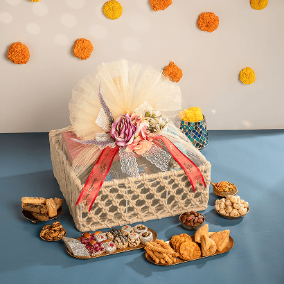 Celebrate joyous festive occasions with Ruchi Rasika, a thoughtfully curated hamper featuring Indulgent Cookies Combo 3 IN 1, Roasted Makhana Cocktail Mix, Roasted Cashew Salt & Pepper, Roasted Almonds Salt & Pepper, Mixture Navarathan, Atta Puri, Butter Muruku, Sukh Sangrah, and Cocktail Samosa. Perfect for gifting or family celebrations, this hamper blends sweet, nutty, and savory flavors for an indulgent festive experience.