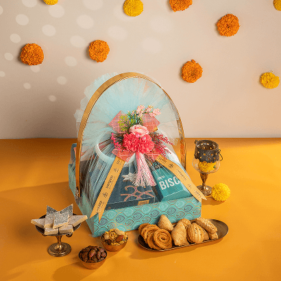 Celebrate joyful occasions with Ruchi Sangam, a festive hamper featuring Moong Chakali, Cashew Butter Biscuits, Roasted Almonds Salt & Pepper, Cocktail Samosa, Kaju Burfi, Jeera Biscuits, and Kashmiri Dalmooth. Perfect for gifting or family celebrations, this hamper blends savory, sweet, and nutty delights for a truly memorable festive experience.