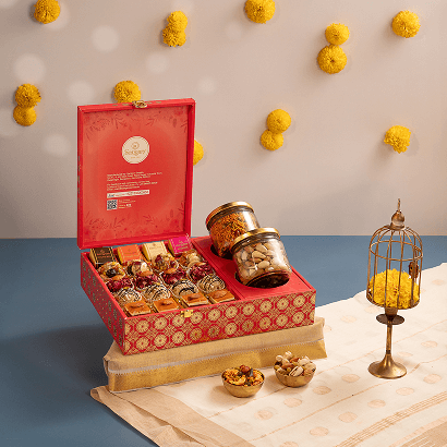 Celebrate joyful moments with Shubh Sangrah, a festive hamper featuring Mixture Navarathan, Dry Fruit Mix, Sugarfree Dryfruit Laddu, Bites Orange, Bites Mewa, Bites Chocolate, Bites Rose, Badam Butter Scotch, Kaju Rose Laddu, and Kaju Mango Delight. Perfect for gifting or family celebrations, this hamper blends sweet, nutty, and indulgent treats for a memorable festive experience.