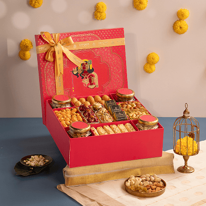 Celebrate the joy of festive moments with Swaad Milaap, a thoughtfully curated hamper featuring Almonds California, Cashew Special, Pistachio Salted, Raisins Special, Mini Kachori, Almond Butter Biscuits, Roasted Makhana Peri Peri, Kashmiri Dalmooth, Kaju Rose Laddu, Sugarfree Dryfruit Laddu, and Bites Chocolate. Perfect for gifting or family celebrations, this hamper blends sweet, nutty, and savory treats for an indulgent festive experience.