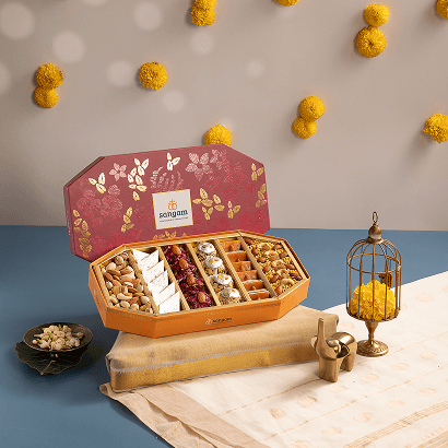 Celebrate togetherness with Swaad Sargam, a curated hamper featuring Dry Fruit Mix, Kashmiri Dalmooth, Kaju Katli, Kaju Choco Shot, Kaju Rose Laddu, and Kaju Mango Delight. Perfect for gifting or festive indulgence, this hamper combines rich, nutty, and sweet flavors for a memorable experience.