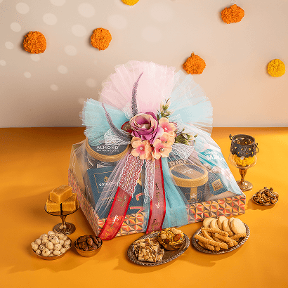 Celebrate the richness of traditional flavors with Swaad Sudha, a thoughtfully curated hamper filled with classic Indian delights and crunchy savouries. From the aromatic Butter Muruku and soft, ghee-rich Mysore Pak to premium Roasted Almonds & Cashews (Salt & Pepper), every bite delivers pure indulgence. The light and wholesome Roasted Makhana, spicy Kashmiri Dalmooth, and melt-in-the-mouth Osmania Biscuits add variety and nostalgia, while the nutty sweetness of Dryfruit Chikki completes this unforgettable experience.