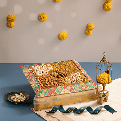 Celebrate festive moments with Tripti Sangrah, a luxurious assortment of Almonds California, Cashew Special, Figs Special, Pistachio Salted, and Raisins Special. Perfect for gifting or indulgent snacking, this hamper offers a rich combination of crunchy, sweet, and nutty flavors.