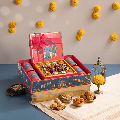 Celebrate every festive moment with Utsav Samanvay, a delightful hamper featuring Dry Fruit Mix, Cashew Butter Biscuits, Kashmiri Dalmooth, Mini Kachori, Kaju Choco Shot, Kaju Rose Laddu, Badam Butter Scotch, and Kaju Mango Delight. Perfect for gifting or family celebrations, this hamper blends sweet, nutty, and savory treats for an indulgent experience.